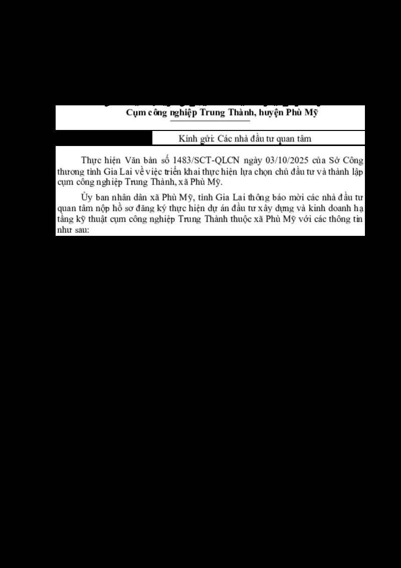 Tiêu đề văn bản | Thông báo tiếp nhận hồ sơ đăng ký thực hiện dự án: Đầu tư xây dựng và kinh doanh hạ tầng kỹ thuật Cụm công nghiệp Trung Thành, huyện Phù Mỹ | ||