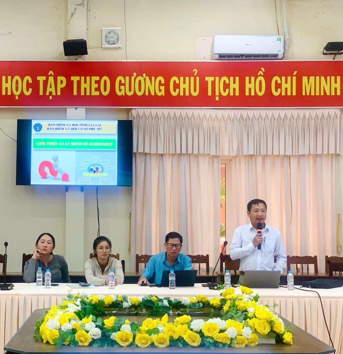 Đồng chí Võ Duy Thạnh - Phó Giám đốc BHXH cơ sở Phù Mỹ thông tin nội dung cơ bản và điểm mới của Luật Bảo hiểm xã hội năm 2024 và Luật sửa đổi, bổ sung một số điều của Luật Bảo hiểm y tế,