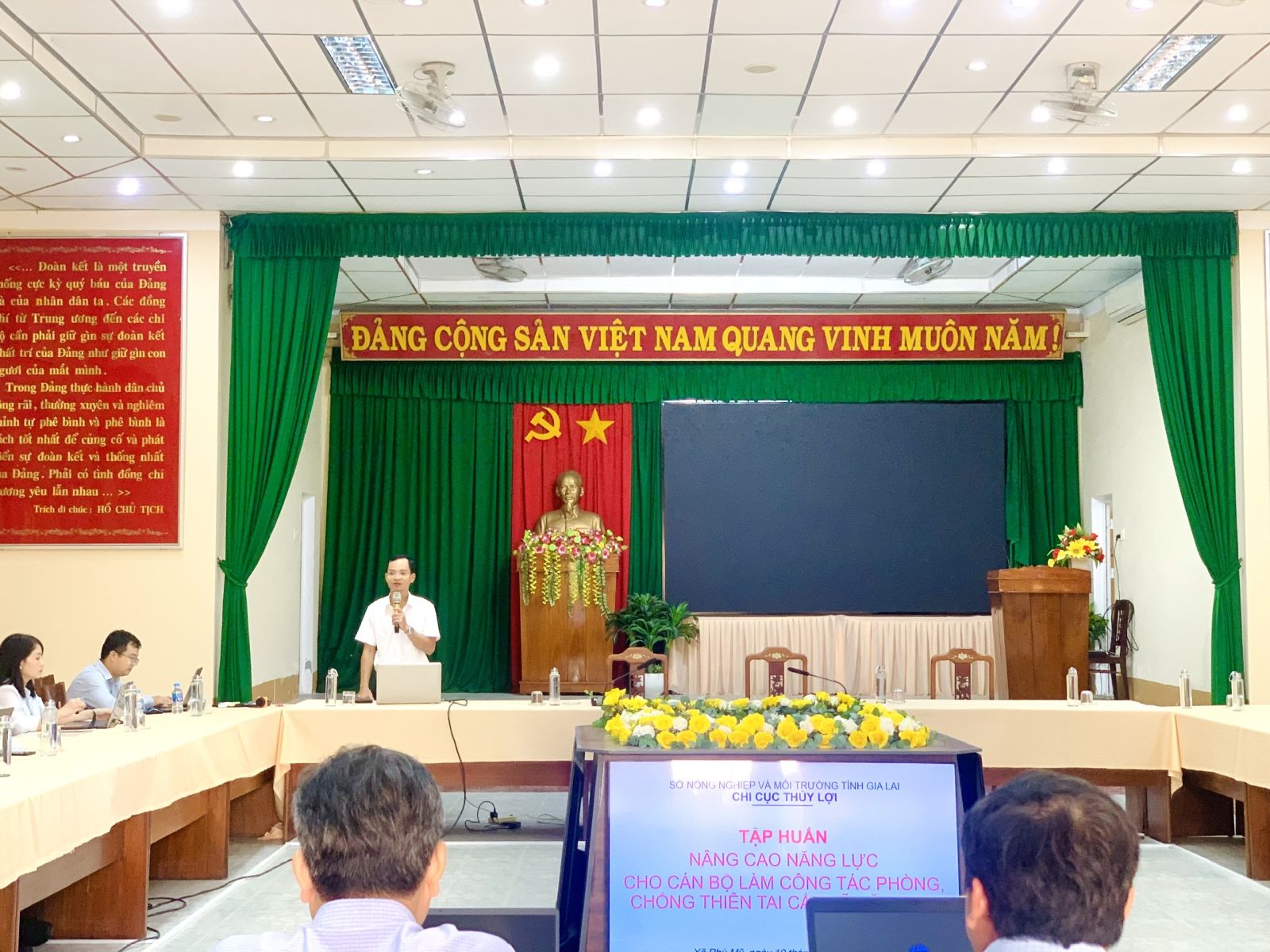 Tại buổi tập huấn, chuyên viên Chi cục Thủy lợi tỉnh Gia Lai thông tin đến các đại biểu về một số nội dung cơ bản trong phòng chống thiên tai như: hướng dẫn xây dựng Kế hoạch phòng, chống thiên tai cấp xã; hướng dẫn xây dựng và củng cố Đội xung kích phòng chống thiên tai cấp xã; xây dựng phương án ứng phó thiên tai; một số loại hình thiên tai thường xảy ra trên địa bàn; trách nhiệm của UBND cấp xã trong hoạt động quản lý nhà nước về phòng, chống thiên tai; Các nhiệm vụ thẩm quyền mới của UBND xã, Chủ tịch UBND xã; Giới thiệu các Thông tư, Nghị định quy định chi tiết một số điều của Luật Phòng, chống thiên tai và Luật sửa đổi, bổ sung một số điều của Luật Phòng, chống thiên tai và Luật Đê điều; ….thông tin Pháp luật về thuỷ lợi, các quy định xử phạt vi phạm hành chính trong lĩnh vực phòng chống thiên tai, thuỷ lợi, đê điều.